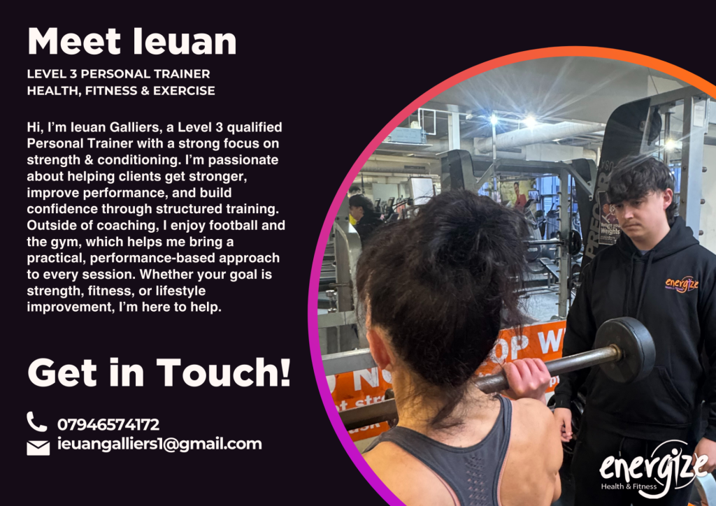 Hi im Jordan one of the personal trainers here at energize i found my passion for fitness at a young age when i was 14 i was quiet overweight so my grandad who was a personal trainer and mr scotland took me to the gym to help my loose some weight it was then i fell in love with fitness and knew i wanted to help people the same way my grandad had done for me i am really friendly and personable person i offer 1 to 1 sessions on working on your goals i have built up loads of knowledge through my college years and from my grandad if you have any questions send me wee message on instagram or if you see me around the gym ask away