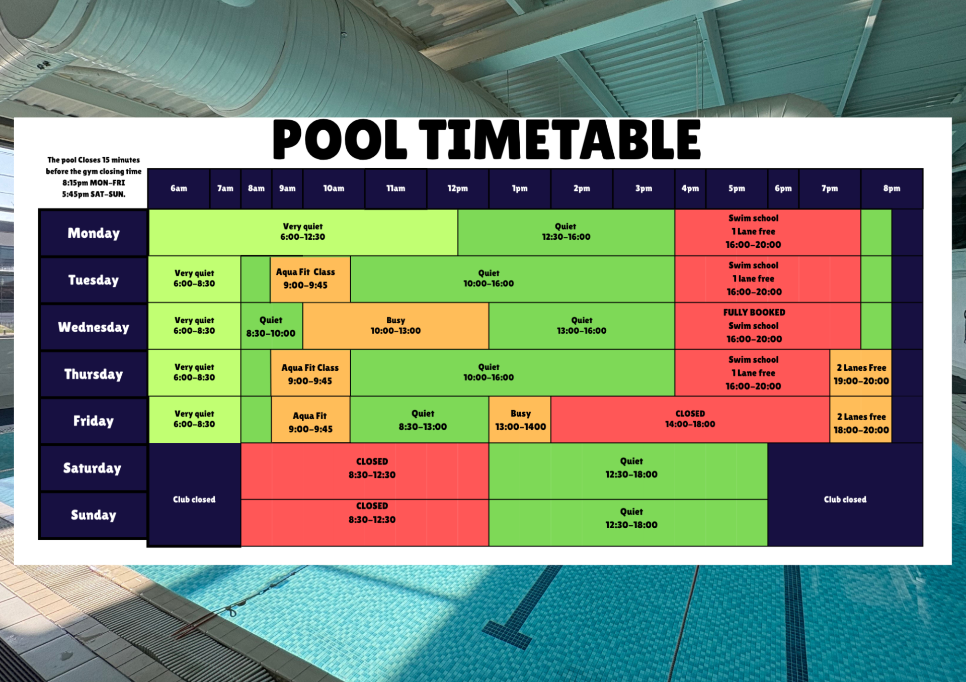 Plan your workouts with ease! Our weekly timetable provides up-to-date schedules for fitness classes, swimming pool availability, and gym opening hours. Use the filters to find the perfect session that fits your routine.
